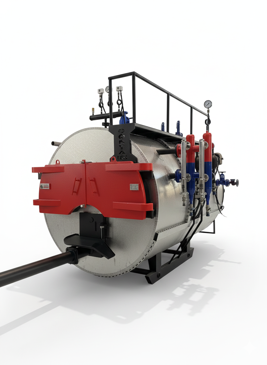 Üç geçişli silindirik gövde yapısına sahip, stokerli ve katı yakıtlı buhar kazanları; kömür, odun ve turba gibi yakıtlarla güvenli ve verimli buhar üretimi sağlar. 500–3000 kg/h aralığındaki buhar ihtiyacını karşılamak üzere tasarlanır. Yüksek kapasite taleplerinde ön ocak yakma sistemi ile kapasite arttırılarak stabil ve sürekli buhar üretimi elde edilir.